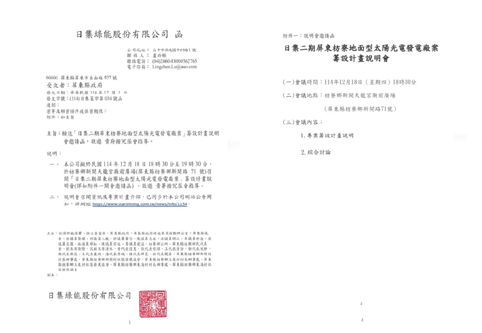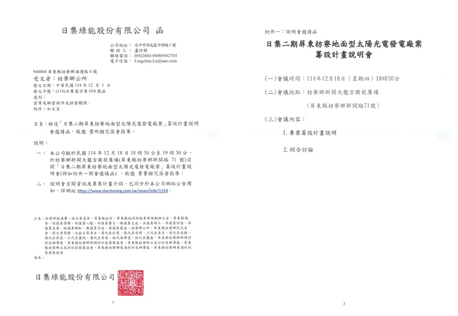 秉持「尊重地方、以居民福祉為優先」的原則,推動日集二期私地太陽光電發電廠,特訂於 114年12月18日(星期四)晚上18:30,於屏東縣枋寮鄉新開天龍宮前廣場舉辦籌設前說明會。